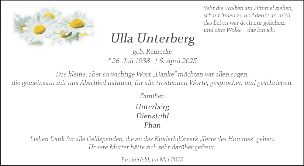Hier finden Sie alle Traueranzeigen aus der Zeitung, die bisher für Ulla Unterberg erschienen sind. Weitere Traueranzeigen, die in der Zeitung erscheinen, werden hier ebenfalls aufgelistet