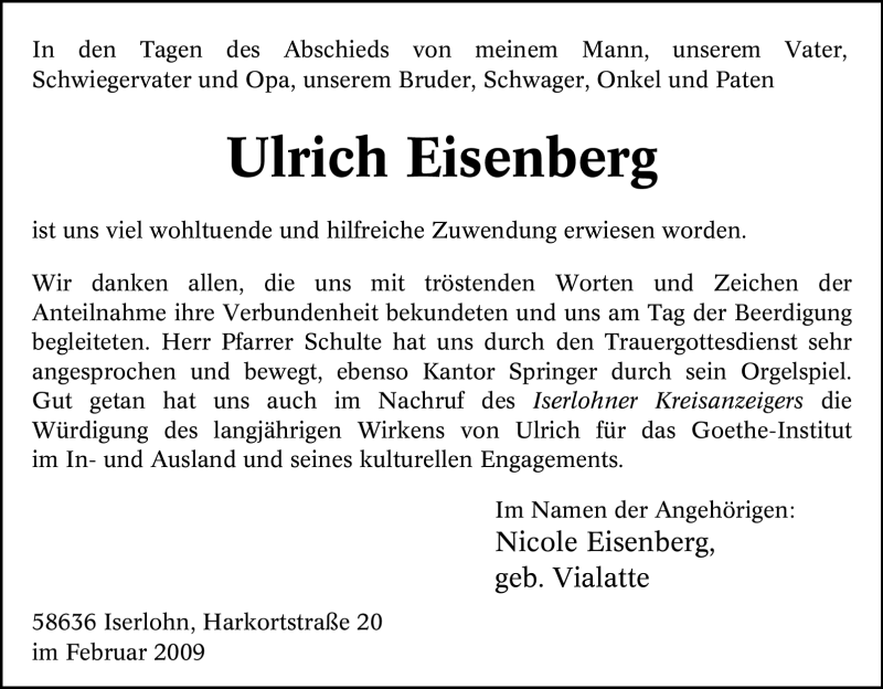 Hier finden Sie alle Traueranzeigen aus der Zeitung, die bisher für Ulrich Eisenberg erschienen sind. Weitere Traueranzeigen, die in der Zeitung erscheinen, werden hier ebenfalls aufgelistet