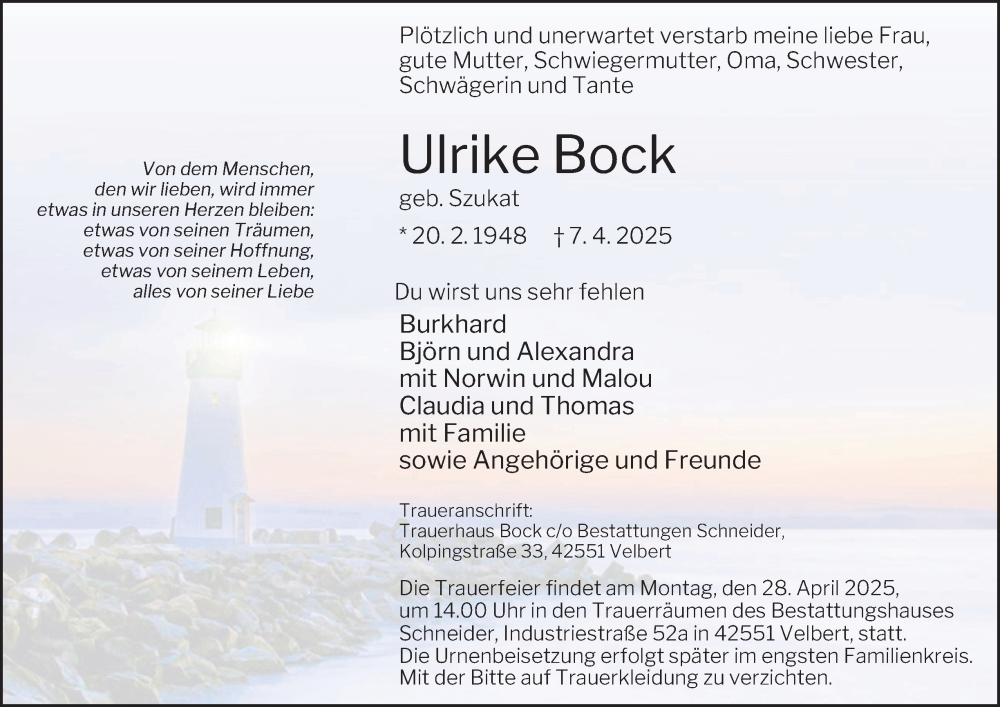 Hier finden Sie alle Traueranzeigen aus der Zeitung, die bisher für Ulrike Bock erschienen sind. Weitere Traueranzeigen, die in der Zeitung erscheinen, werden hier ebenfalls aufgelistet