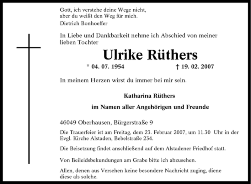 Hier finden Sie alle Traueranzeigen aus der Zeitung, die bisher für Ulrike Rüthers erschienen sind. Weitere Traueranzeigen, die in der Zeitung erscheinen, werden hier ebenfalls aufgelistet