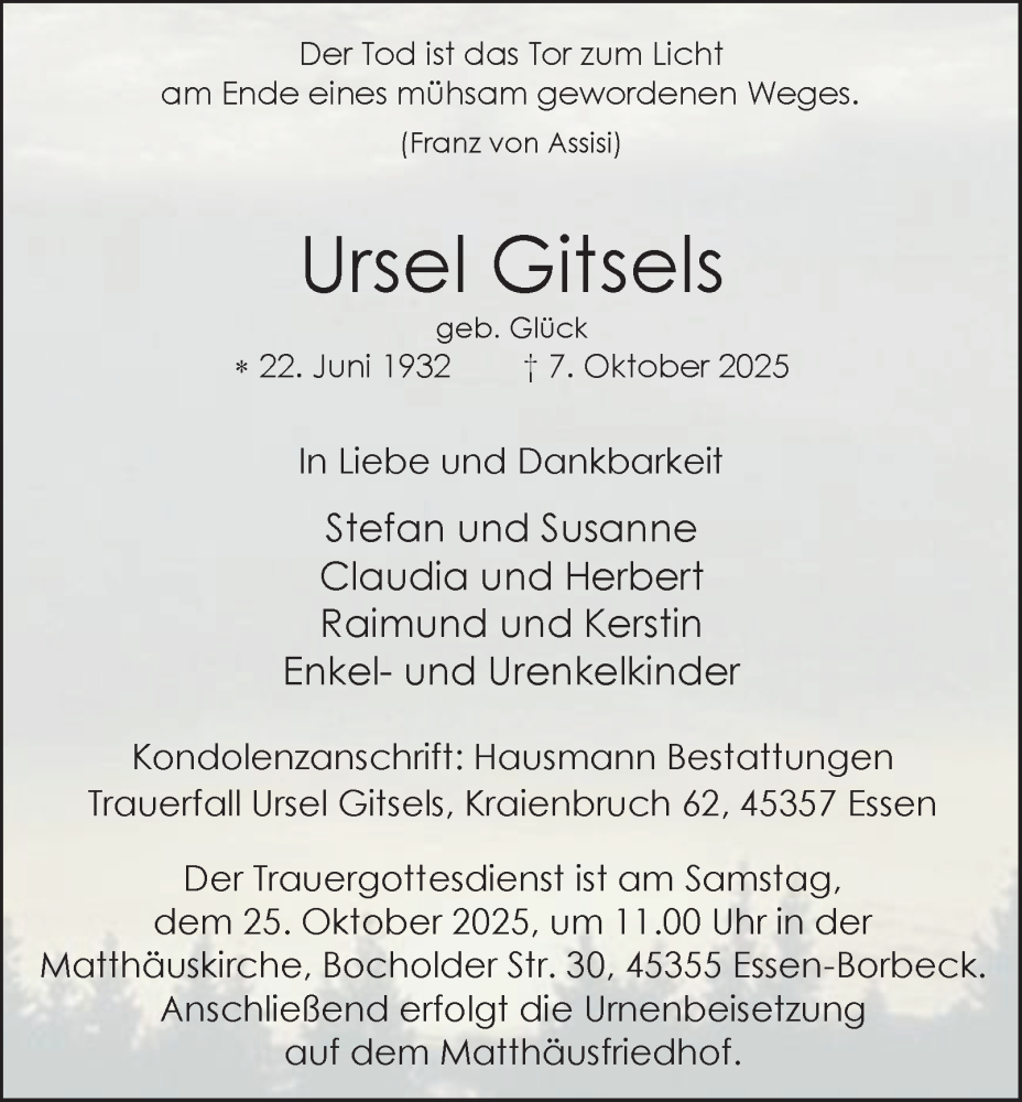 Hier finden Sie alle Traueranzeigen aus der Zeitung, die bisher für Ursel Gitsels erschienen sind. Weitere Traueranzeigen, die in der Zeitung erscheinen, werden hier ebenfalls aufgelistet