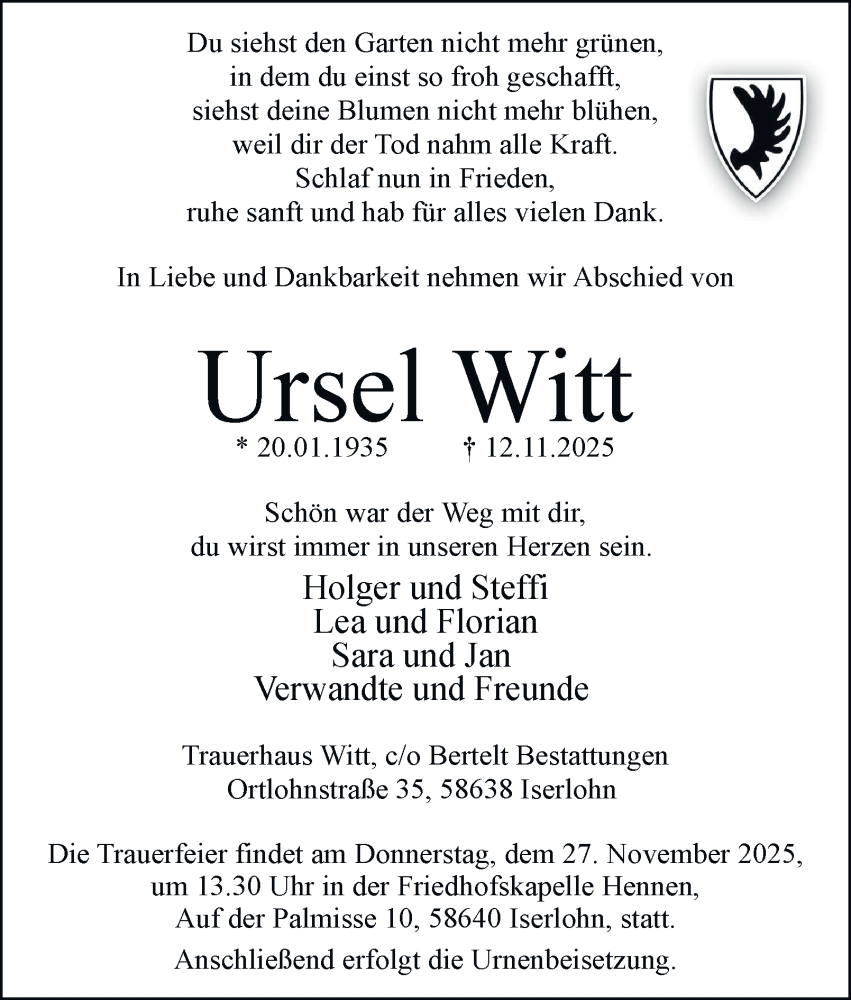 Hier finden Sie alle Traueranzeigen aus der Zeitung, die bisher für Ursel Witt erschienen sind. Weitere Traueranzeigen, die in der Zeitung erscheinen, werden hier ebenfalls aufgelistet