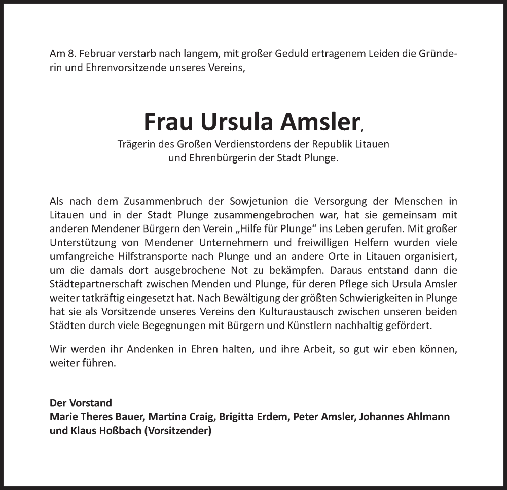 Hier finden Sie alle Traueranzeigen aus der Zeitung, die bisher für Ursula Amsler erschienen sind. Weitere Traueranzeigen, die in der Zeitung erscheinen, werden hier ebenfalls aufgelistet