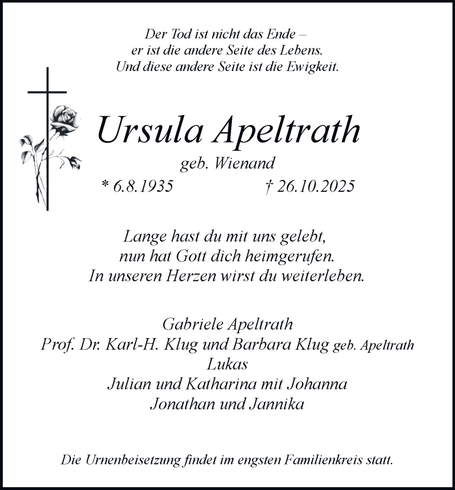 Hier finden Sie alle Traueranzeigen aus der Zeitung, die bisher für Ursula Apeltrath erschienen sind. Weitere Traueranzeigen, die in der Zeitung erscheinen, werden hier ebenfalls aufgelistet