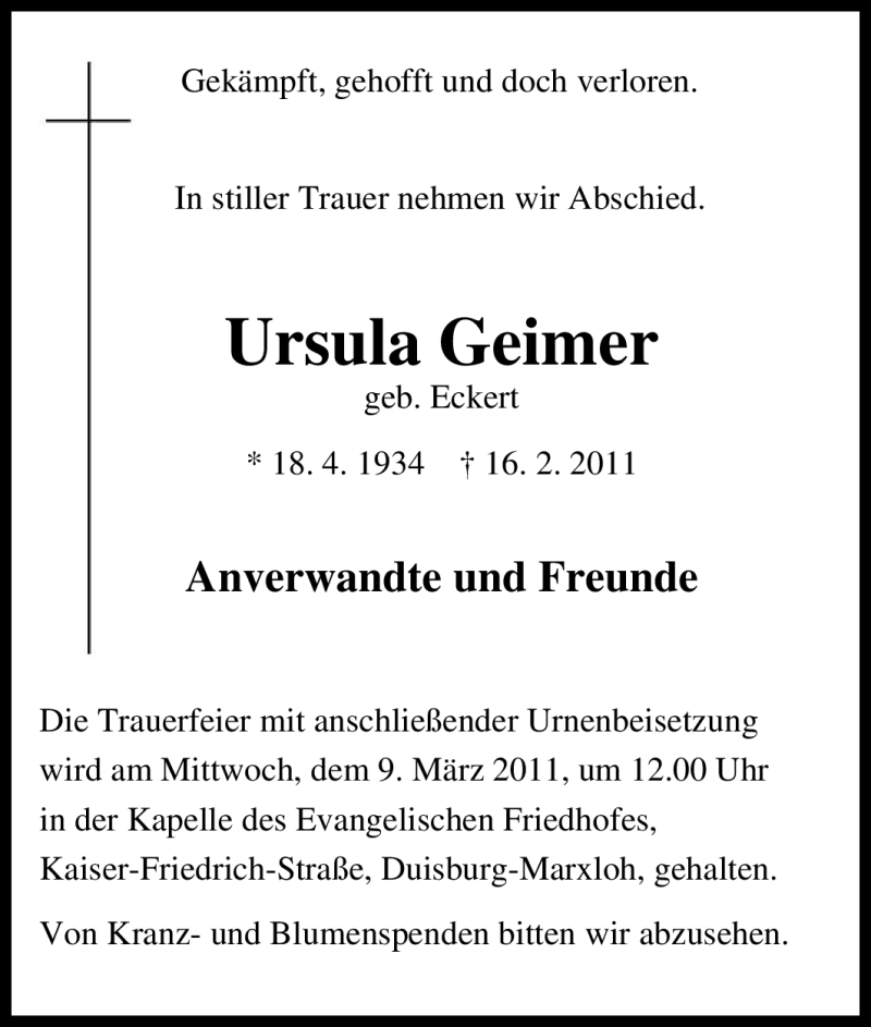 Hier finden Sie alle Traueranzeigen aus der Zeitung, die bisher für Ursula Geimer erschienen sind. Weitere Traueranzeigen, die in der Zeitung erscheinen, werden hier ebenfalls aufgelistet