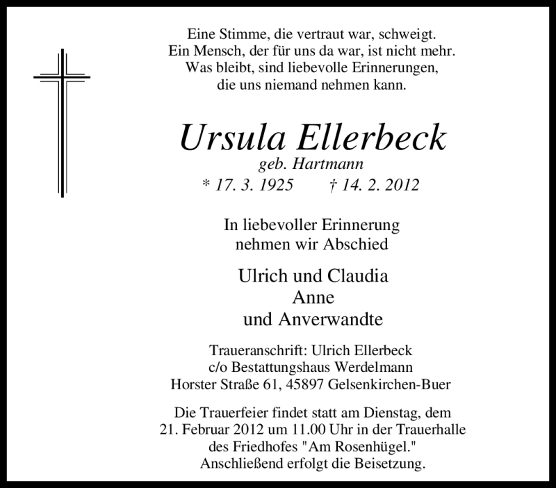 Hier finden Sie alle Traueranzeigen aus der Zeitung, die bisher für Ursula Hartmann erschienen sind. Weitere Traueranzeigen, die in der Zeitung erscheinen, werden hier ebenfalls aufgelistet