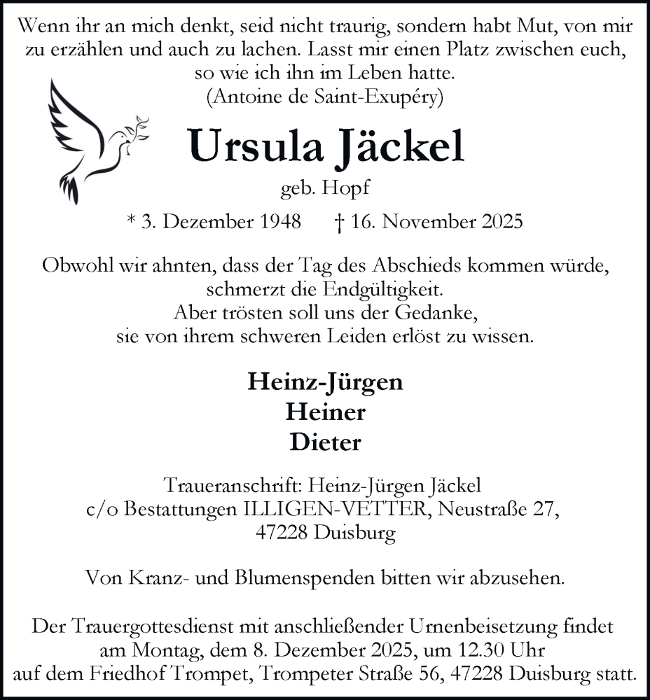 Hier finden Sie alle Traueranzeigen aus der Zeitung, die bisher für Ursula Jäckel erschienen sind. Weitere Traueranzeigen, die in der Zeitung erscheinen, werden hier ebenfalls aufgelistet