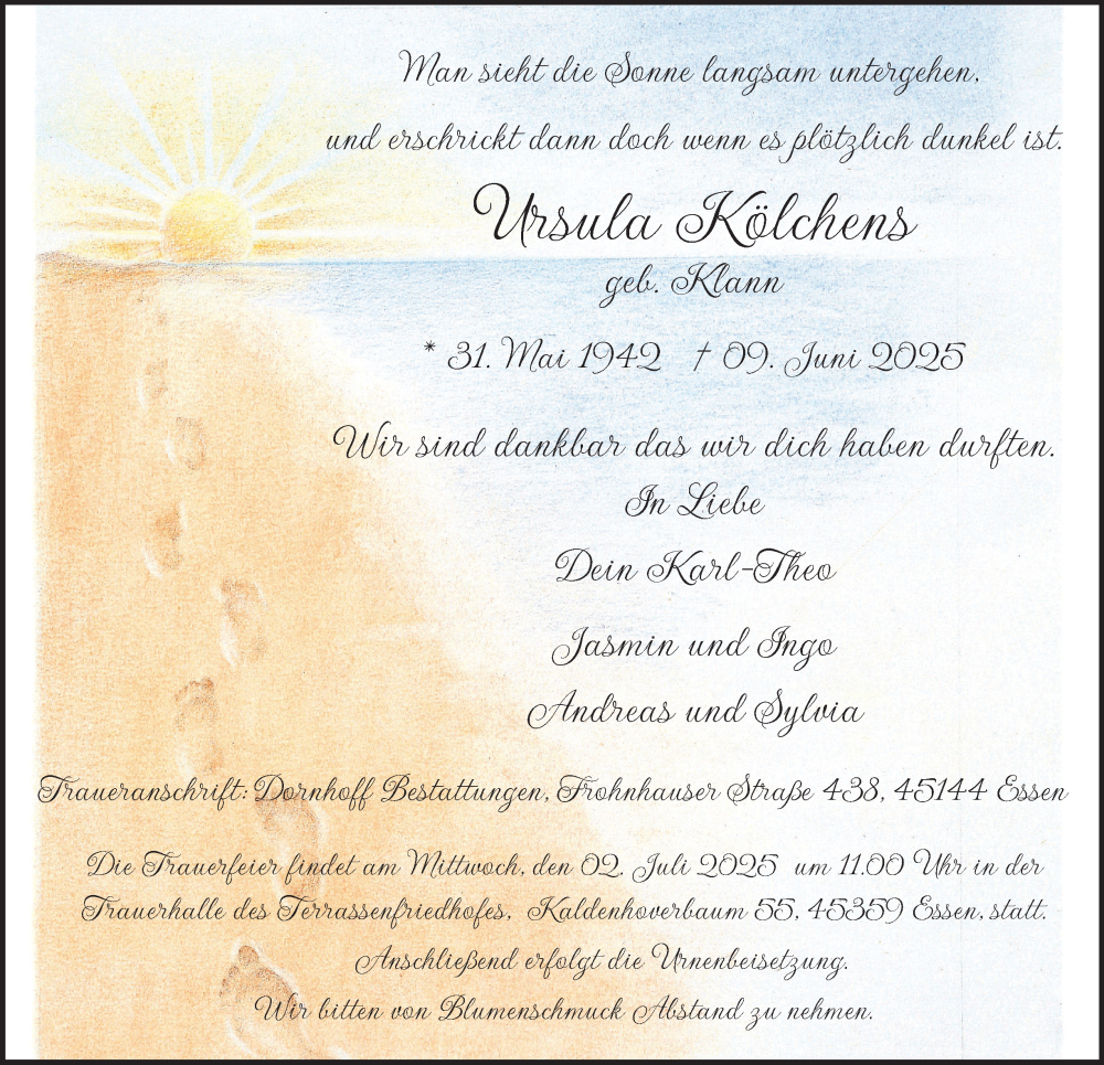 Hier finden Sie alle Traueranzeigen aus der Zeitung, die bisher für Ursula Kölchens erschienen sind. Weitere Traueranzeigen, die in der Zeitung erscheinen, werden hier ebenfalls aufgelistet