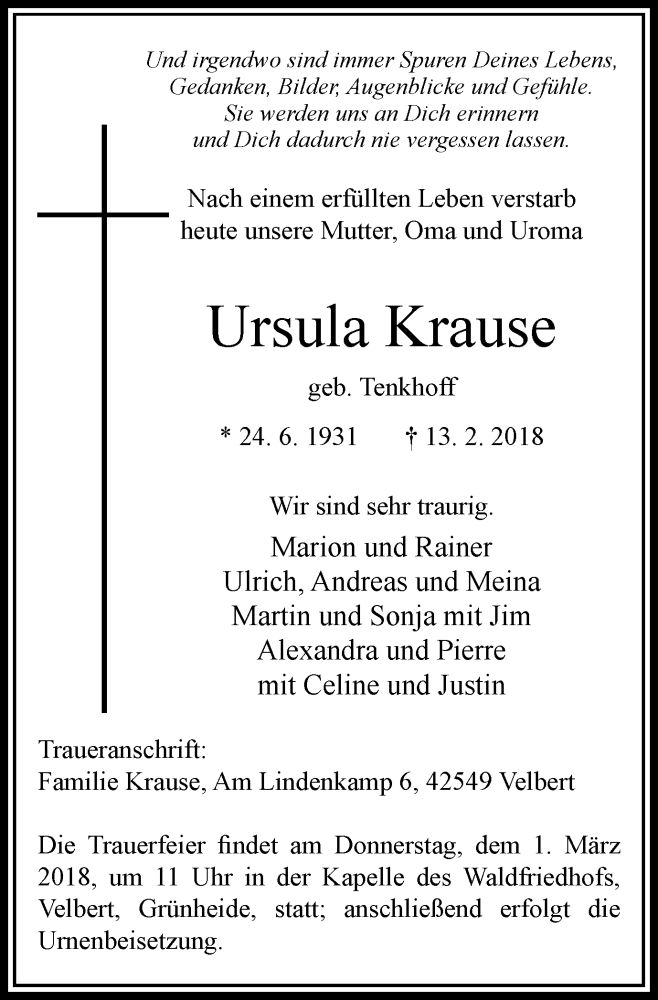 Hier finden Sie alle Traueranzeigen aus der Zeitung, die bisher für Ursula Krause erschienen sind. Weitere Traueranzeigen, die in der Zeitung erscheinen, werden hier ebenfalls aufgelistet