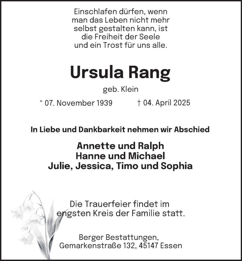 Hier finden Sie alle Traueranzeigen aus der Zeitung, die bisher für Ursula Rang erschienen sind. Weitere Traueranzeigen, die in der Zeitung erscheinen, werden hier ebenfalls aufgelistet