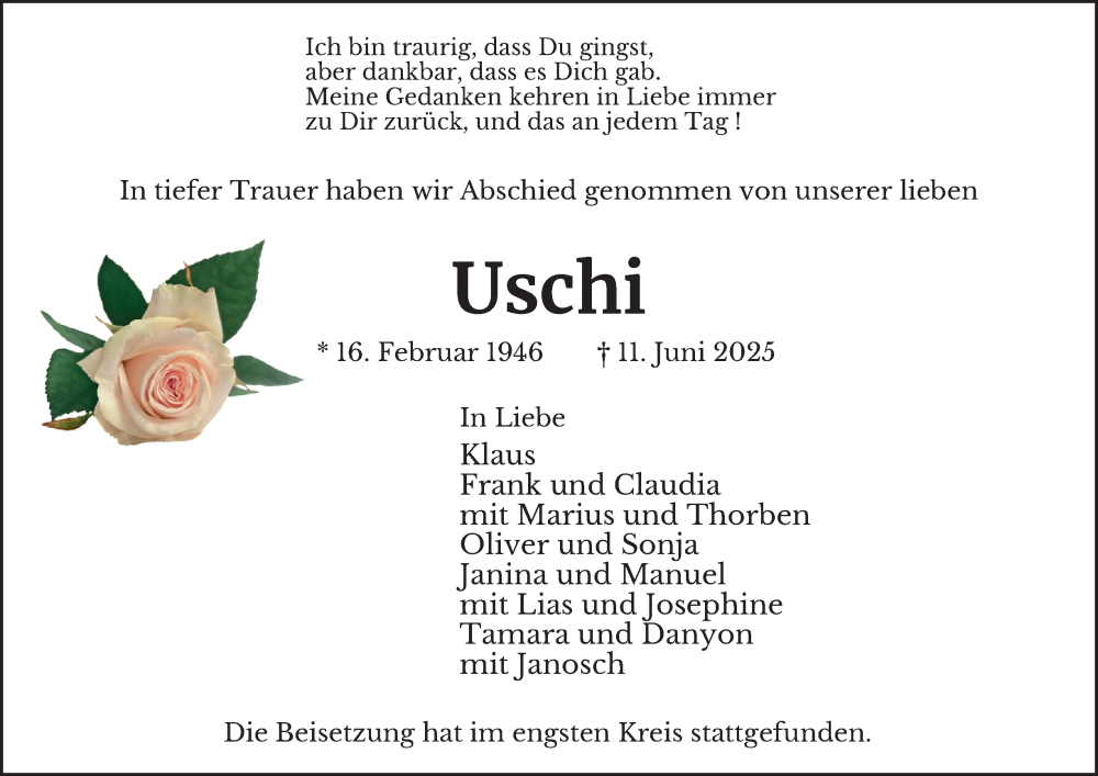 Hier finden Sie alle Traueranzeigen aus der Zeitung, die bisher für Uschi erschienen sind. Weitere Traueranzeigen, die in der Zeitung erscheinen, werden hier ebenfalls aufgelistet