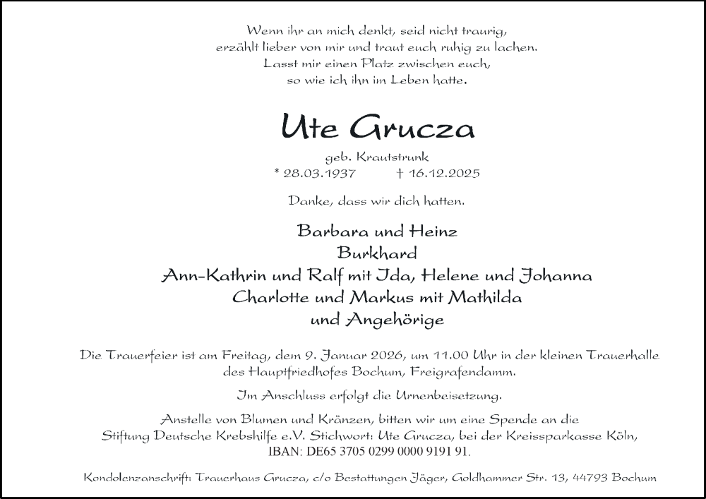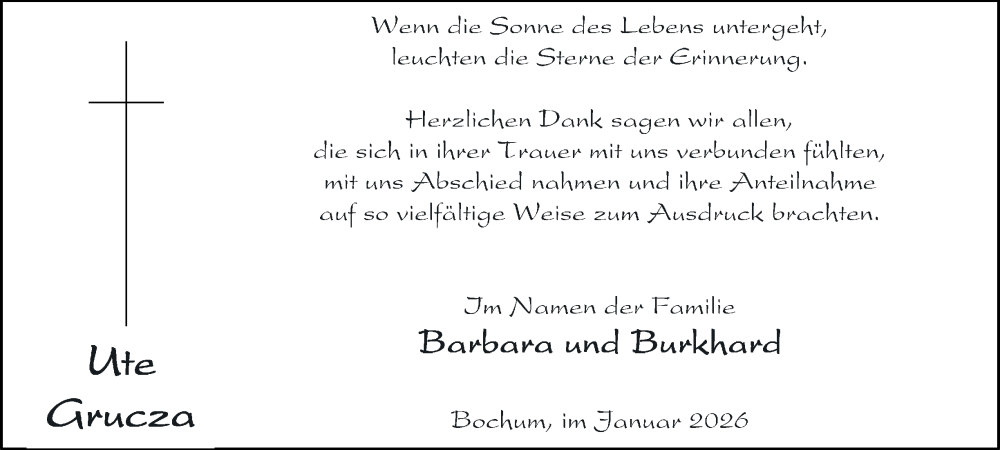 Hier finden Sie alle Traueranzeigen aus der Zeitung, die bisher für Ute Grucza erschienen sind. Weitere Traueranzeigen, die in der Zeitung erscheinen, werden hier ebenfalls aufgelistet