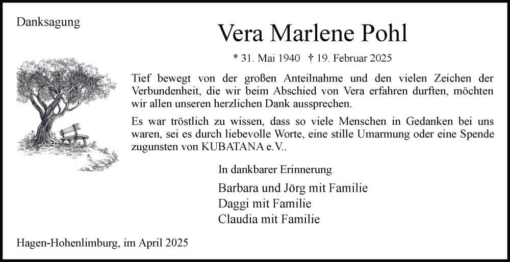 Hier finden Sie alle Traueranzeigen aus der Zeitung, die bisher für Vera Marlene Pohl erschienen sind. Weitere Traueranzeigen, die in der Zeitung erscheinen, werden hier ebenfalls aufgelistet