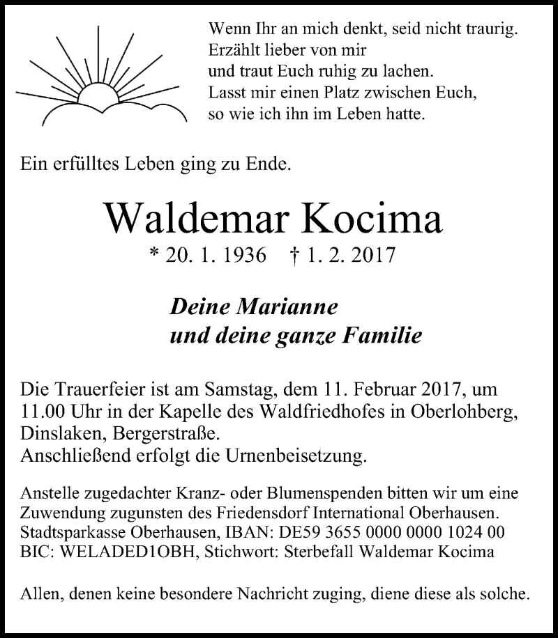 Hier finden Sie alle Traueranzeigen aus der Zeitung, die bisher für Waldemar Kocima erschienen sind. Weitere Traueranzeigen, die in der Zeitung erscheinen, werden hier ebenfalls aufgelistet