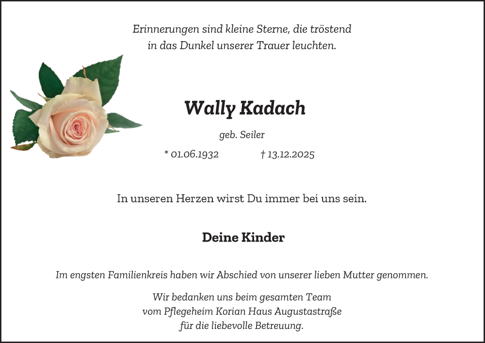 Hier finden Sie alle Traueranzeigen aus der Zeitung, die bisher für Wally Kadach erschienen sind. Weitere Traueranzeigen, die in der Zeitung erscheinen, werden hier ebenfalls aufgelistet