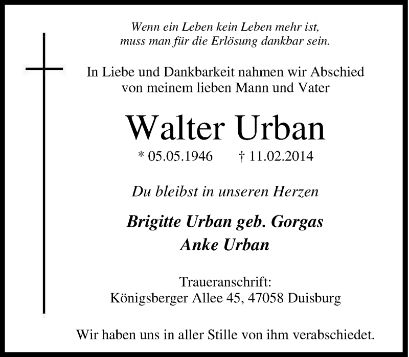 Hier finden Sie alle Traueranzeigen aus der Zeitung, die bisher für Walter Urban erschienen sind. Weitere Traueranzeigen, die in der Zeitung erscheinen, werden hier ebenfalls aufgelistet