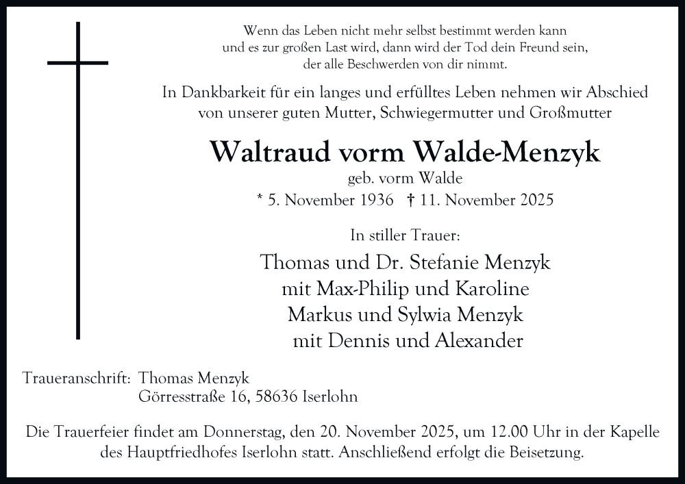 Hier finden Sie alle Traueranzeigen aus der Zeitung, die bisher für Waltraud vorm Walde-Menzyk erschienen sind. Weitere Traueranzeigen, die in der Zeitung erscheinen, werden hier ebenfalls aufgelistet