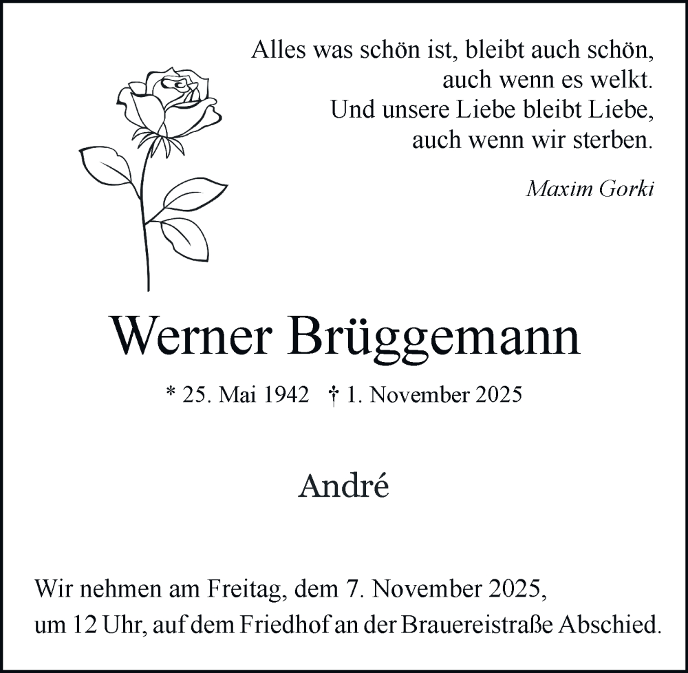 Hier finden Sie alle Traueranzeigen aus der Zeitung, die bisher für Werner Brüggemann erschienen sind. Weitere Traueranzeigen, die in der Zeitung erscheinen, werden hier ebenfalls aufgelistet
