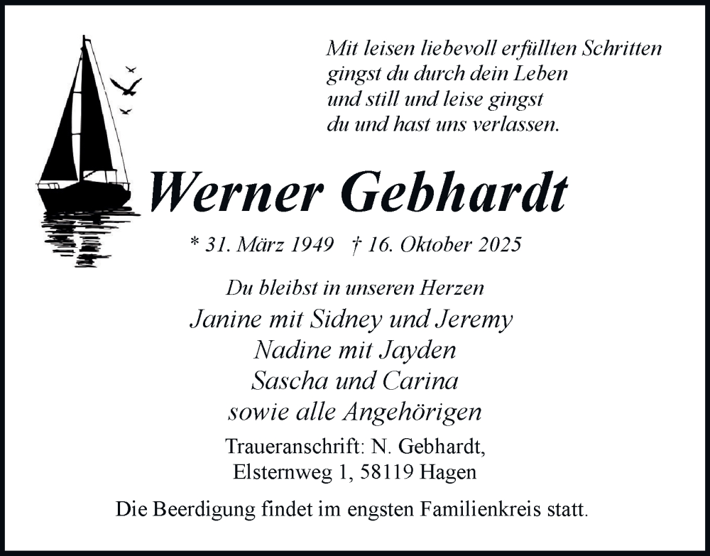 Hier finden Sie alle Traueranzeigen aus der Zeitung, die bisher für Werner Gebhardt erschienen sind. Weitere Traueranzeigen, die in der Zeitung erscheinen, werden hier ebenfalls aufgelistet