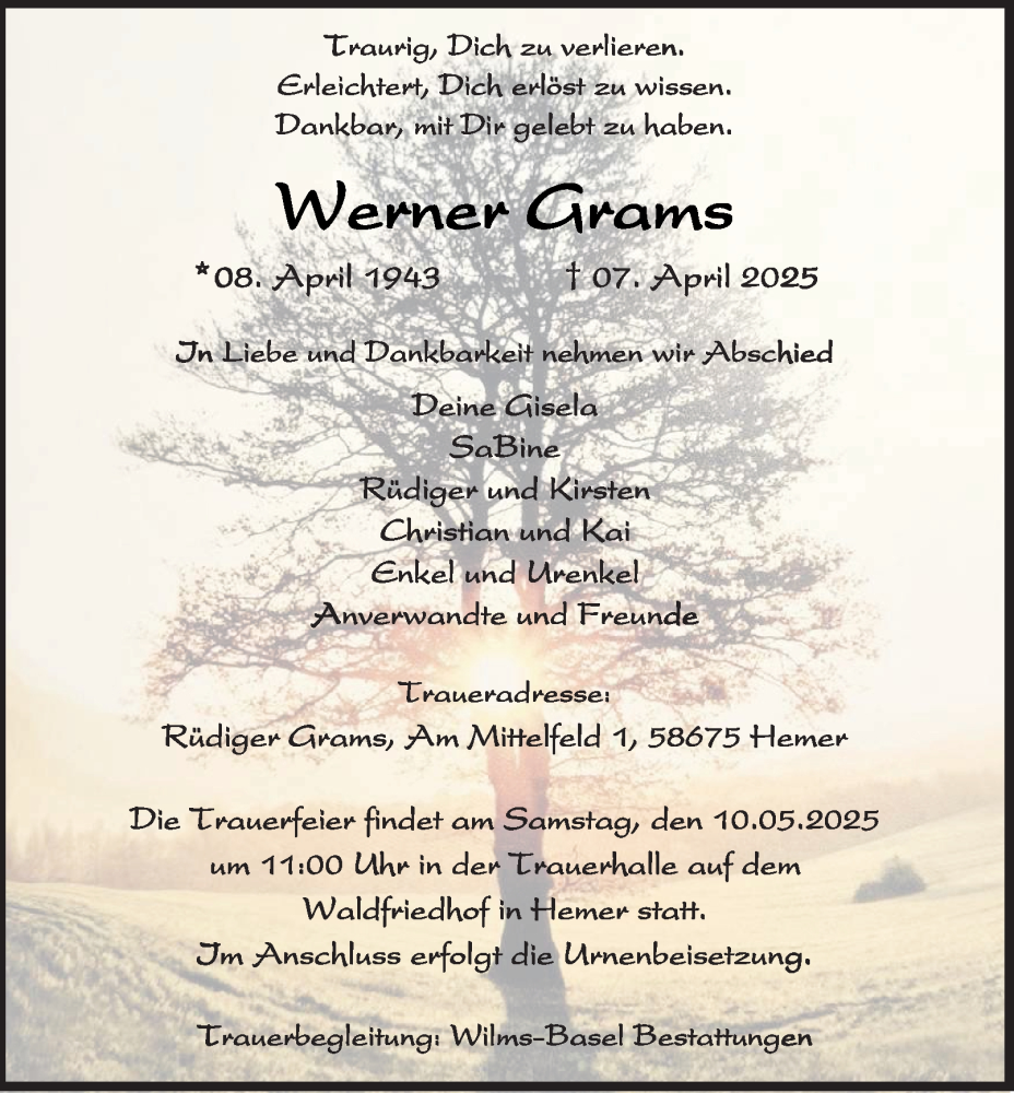 Hier finden Sie alle Traueranzeigen aus der Zeitung, die bisher für Werner Grams erschienen sind. Weitere Traueranzeigen, die in der Zeitung erscheinen, werden hier ebenfalls aufgelistet