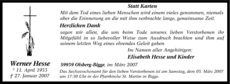 Hier finden Sie alle Traueranzeigen aus der Zeitung, die bisher für Werner Hesse erschienen sind. Weitere Traueranzeigen, die in der Zeitung erscheinen, werden hier ebenfalls aufgelistet