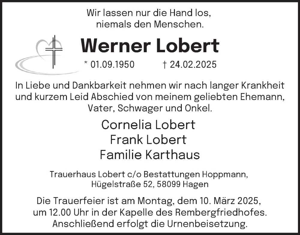 Hier finden Sie alle Traueranzeigen aus der Zeitung, die bisher für Werner Lobert erschienen sind. Weitere Traueranzeigen, die in der Zeitung erscheinen, werden hier ebenfalls aufgelistet