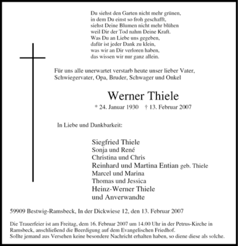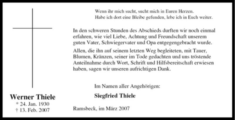 Hier finden Sie alle Traueranzeigen aus der Zeitung, die bisher für Werner Thiele erschienen sind. Weitere Traueranzeigen, die in der Zeitung erscheinen, werden hier ebenfalls aufgelistet