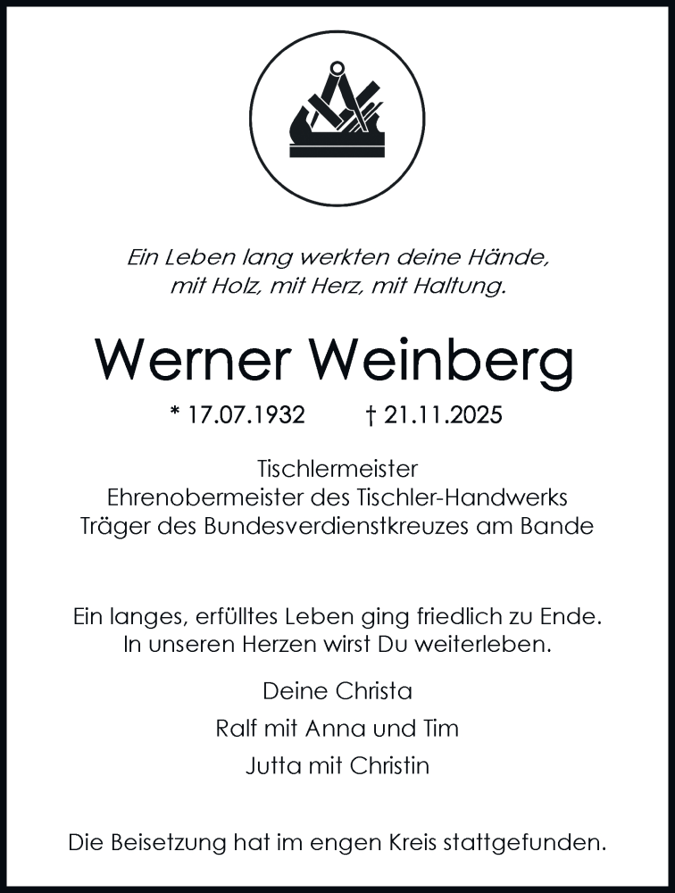 Hier finden Sie alle Traueranzeigen aus der Zeitung, die bisher für Werner Weinberg erschienen sind. Weitere Traueranzeigen, die in der Zeitung erscheinen, werden hier ebenfalls aufgelistet