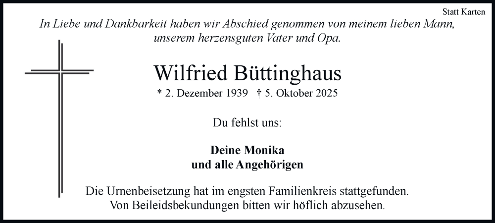 Hier finden Sie alle Traueranzeigen aus der Zeitung, die bisher für Wilfried Büttinghaus erschienen sind. Weitere Traueranzeigen, die in der Zeitung erscheinen, werden hier ebenfalls aufgelistet