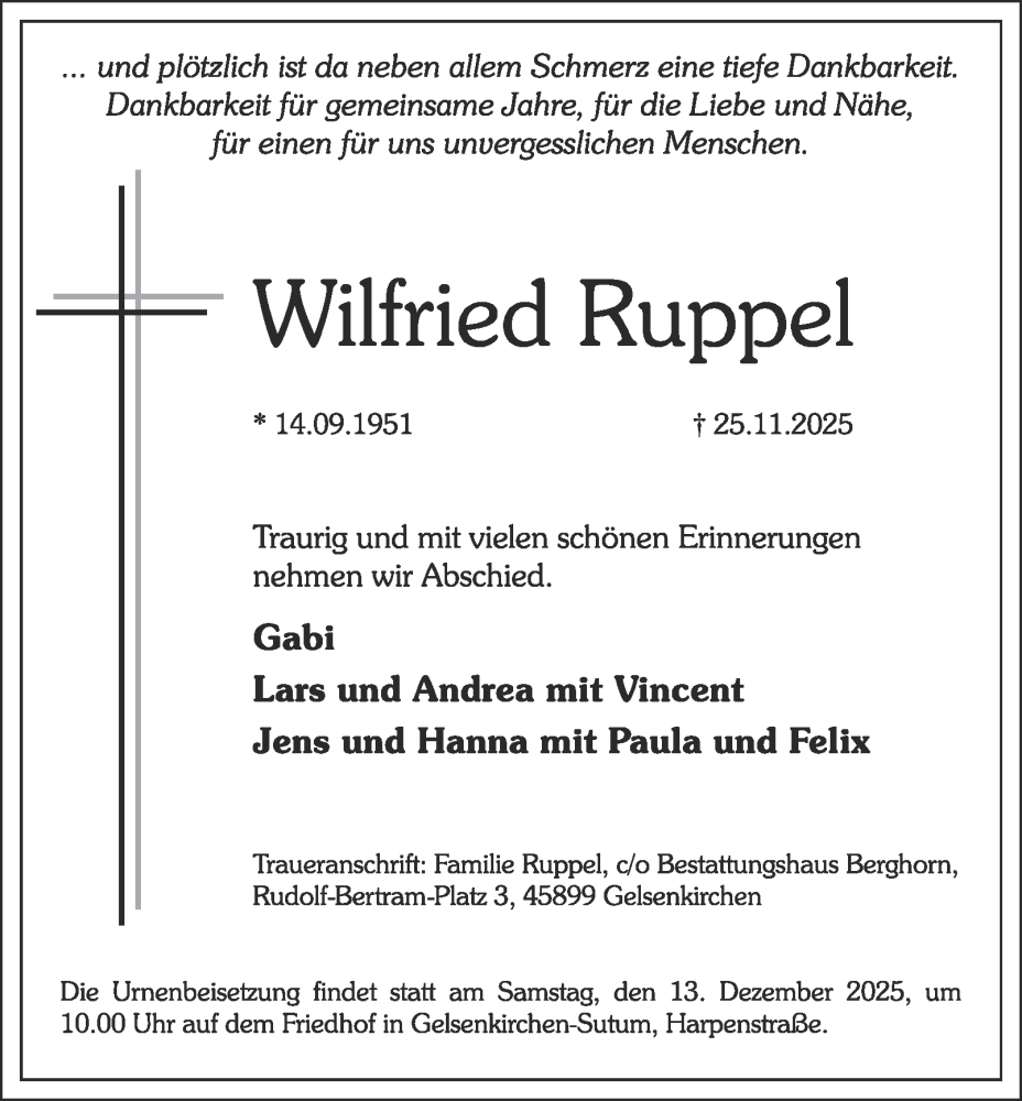 Hier finden Sie alle Traueranzeigen aus der Zeitung, die bisher für Wilfried Ruppel erschienen sind. Weitere Traueranzeigen, die in der Zeitung erscheinen, werden hier ebenfalls aufgelistet