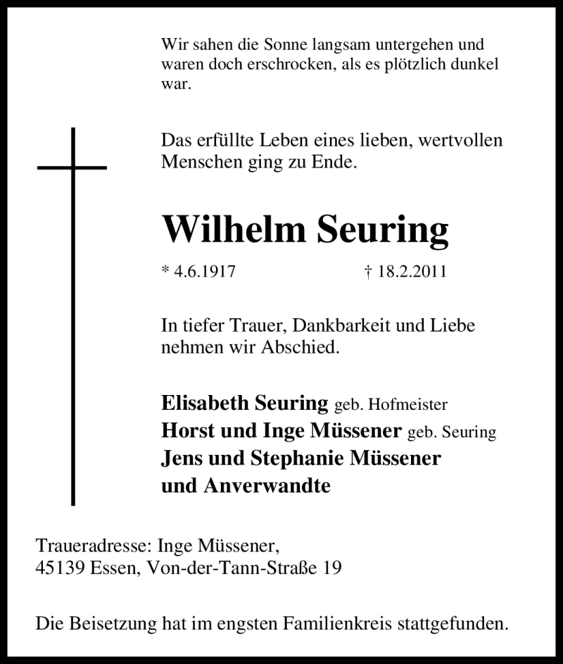 Hier finden Sie alle Traueranzeigen aus der Zeitung, die bisher für Wilhelm Seuring erschienen sind. Weitere Traueranzeigen, die in der Zeitung erscheinen, werden hier ebenfalls aufgelistet