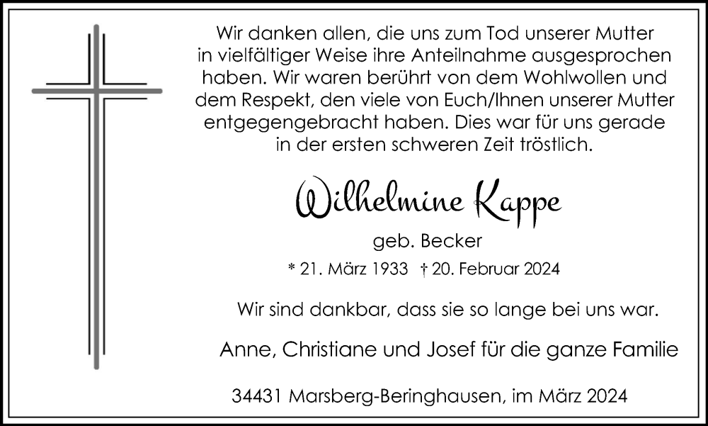 Hier finden Sie alle Traueranzeigen aus der Zeitung, die bisher für Wilhelmine Kappe erschienen sind. Weitere Traueranzeigen, die in der Zeitung erscheinen, werden hier ebenfalls aufgelistet