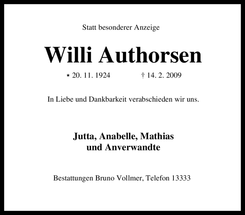 Hier finden Sie alle Traueranzeigen aus der Zeitung, die bisher für Willi Authorsen erschienen sind. Weitere Traueranzeigen, die in der Zeitung erscheinen, werden hier ebenfalls aufgelistet