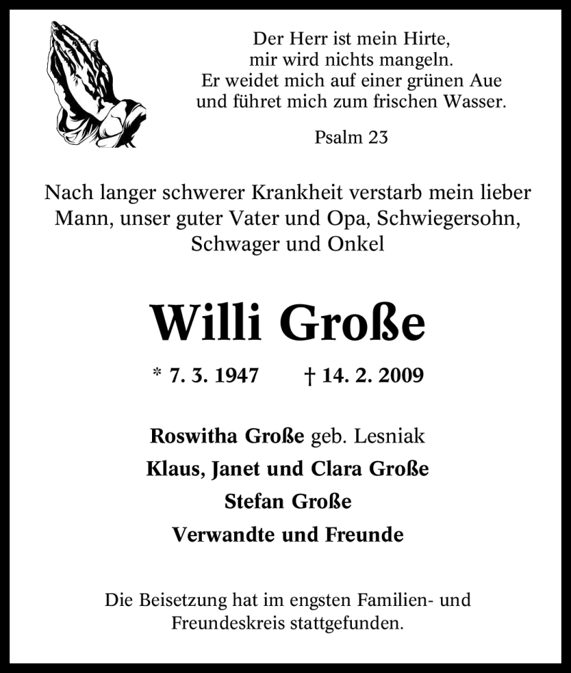 Hier finden Sie alle Traueranzeigen aus der Zeitung, die bisher für Willi Große erschienen sind. Weitere Traueranzeigen, die in der Zeitung erscheinen, werden hier ebenfalls aufgelistet