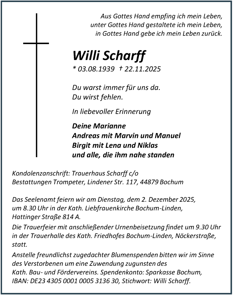 Hier finden Sie alle Traueranzeigen aus der Zeitung, die bisher für Willi Scharff erschienen sind. Weitere Traueranzeigen, die in der Zeitung erscheinen, werden hier ebenfalls aufgelistet
