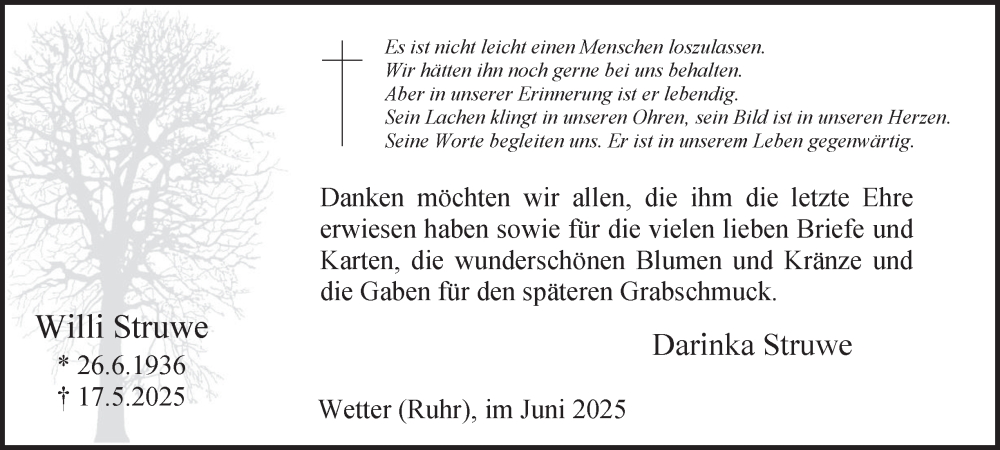 Hier finden Sie alle Traueranzeigen aus der Zeitung, die bisher für Willi Struwe erschienen sind. Weitere Traueranzeigen, die in der Zeitung erscheinen, werden hier ebenfalls aufgelistet