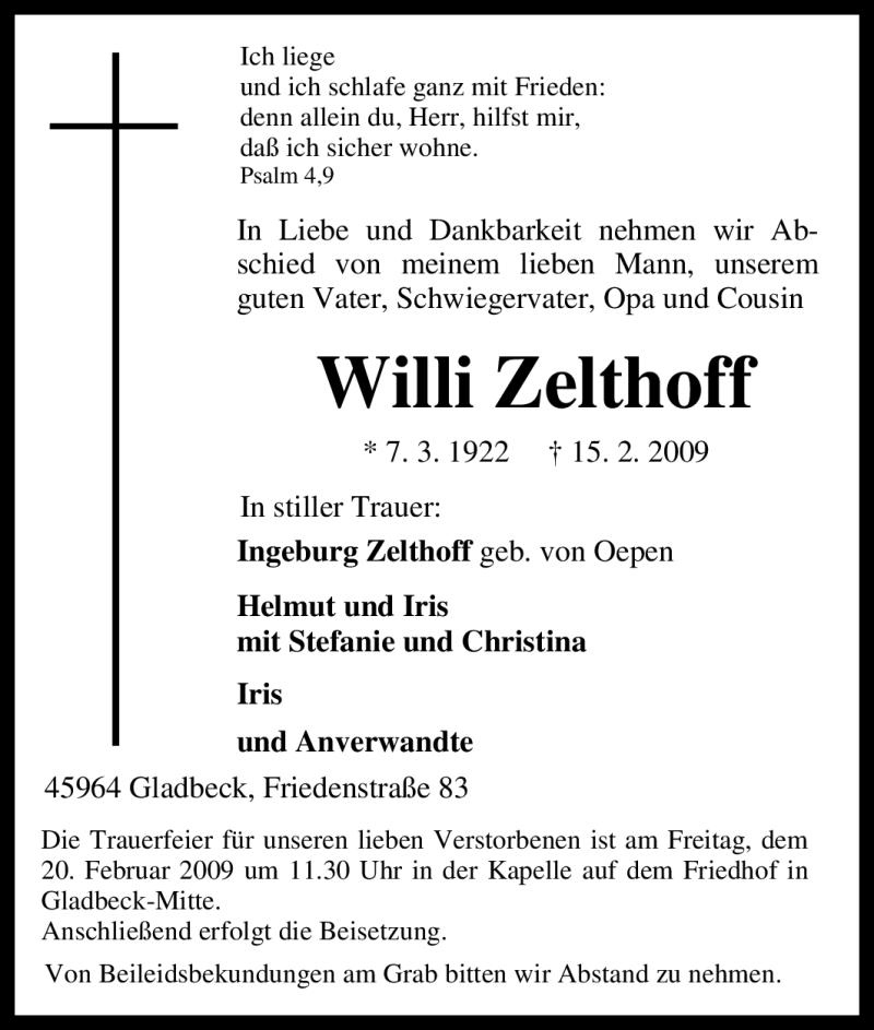 Hier finden Sie alle Traueranzeigen aus der Zeitung, die bisher für Willi Zelthoff erschienen sind. Weitere Traueranzeigen, die in der Zeitung erscheinen, werden hier ebenfalls aufgelistet