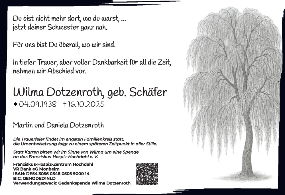 Hier finden Sie alle Traueranzeigen aus der Zeitung, die bisher für Wilma Dotzenroth erschienen sind. Weitere Traueranzeigen, die in der Zeitung erscheinen, werden hier ebenfalls aufgelistet