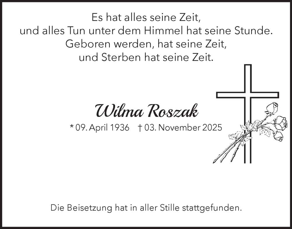 Hier finden Sie alle Traueranzeigen aus der Zeitung, die bisher für Wilma Roszak erschienen sind. Weitere Traueranzeigen, die in der Zeitung erscheinen, werden hier ebenfalls aufgelistet