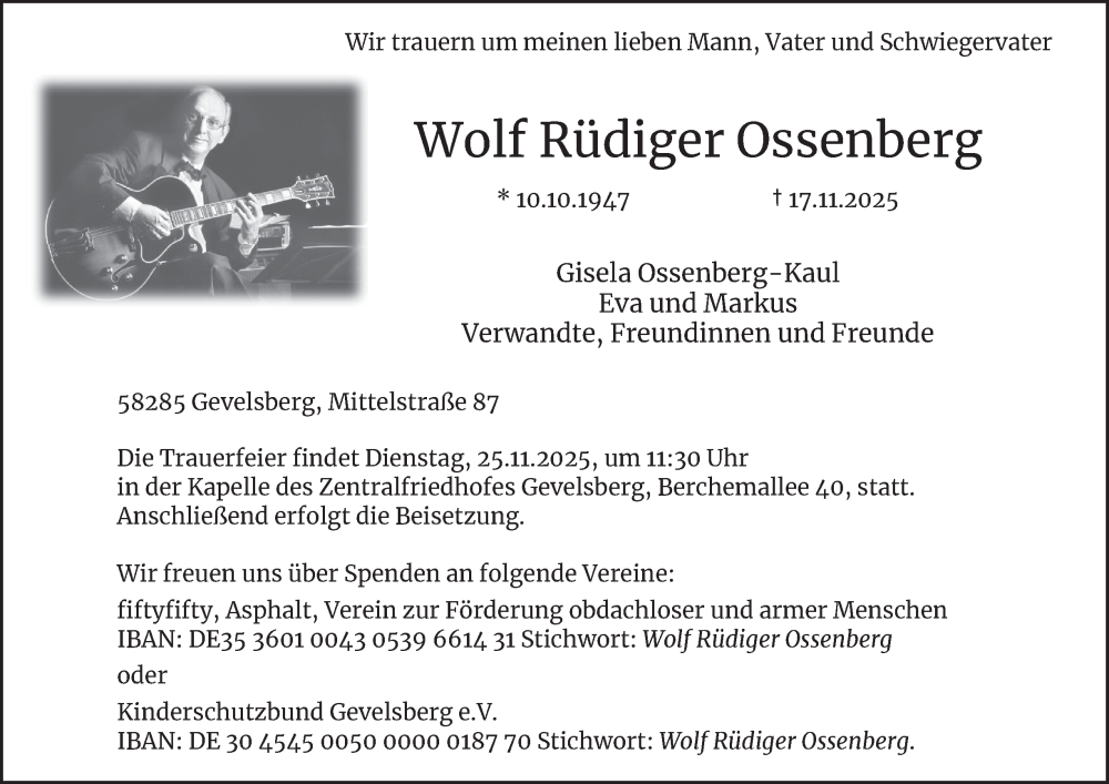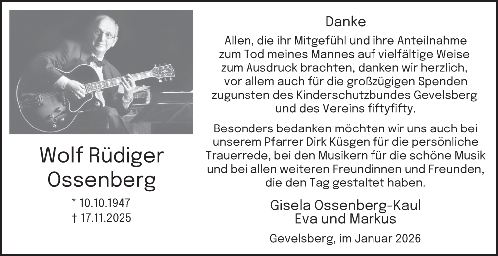 Hier finden Sie alle Traueranzeigen aus der Zeitung, die bisher für Wolf Rüdiger Ossenberg erschienen sind. Weitere Traueranzeigen, die in der Zeitung erscheinen, werden hier ebenfalls aufgelistet