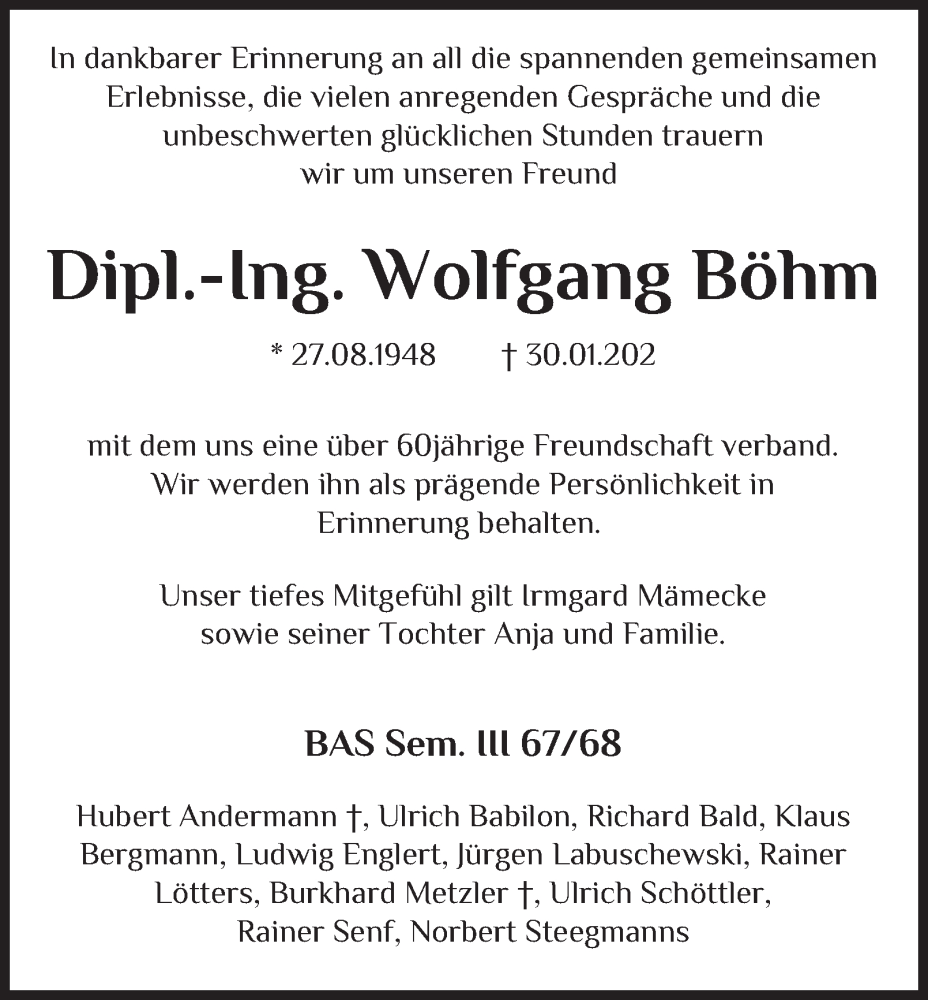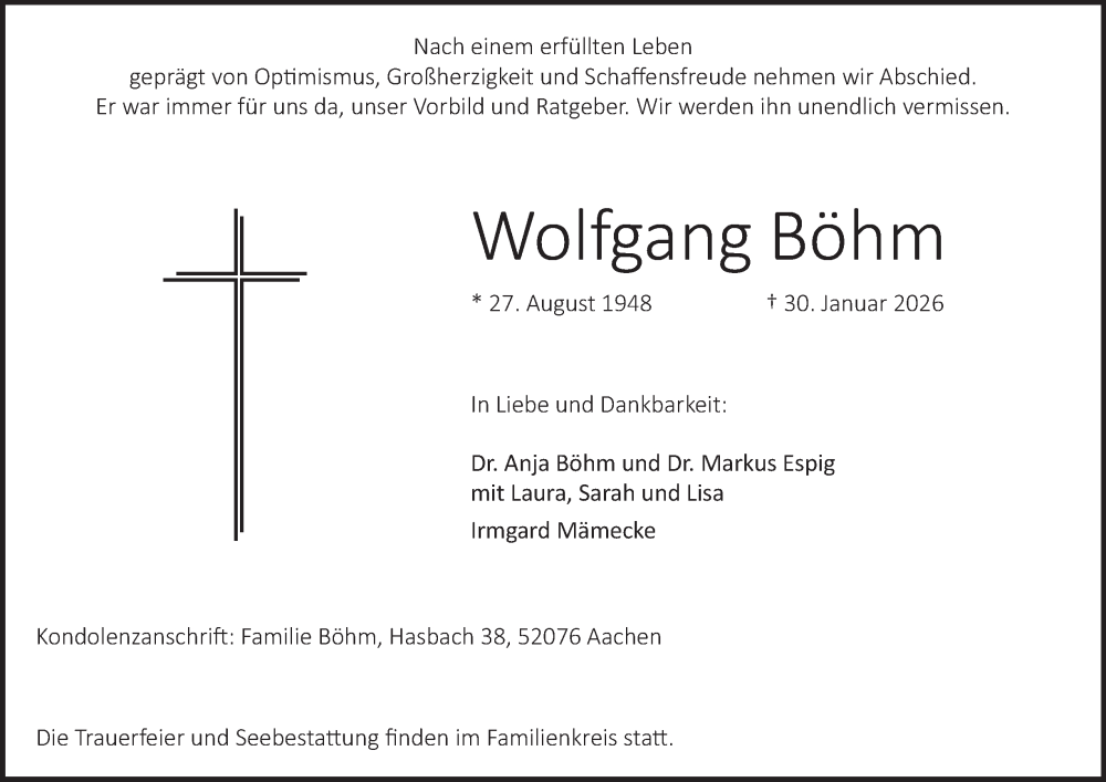 Hier finden Sie alle Traueranzeigen aus der Zeitung, die bisher für Wolfgang Böhm erschienen sind. Weitere Traueranzeigen, die in der Zeitung erscheinen, werden hier ebenfalls aufgelistet