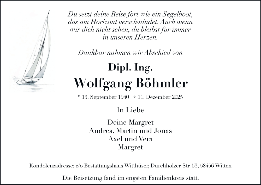 Hier finden Sie alle Traueranzeigen aus der Zeitung, die bisher für Wolfgang Böhmler erschienen sind. Weitere Traueranzeigen, die in der Zeitung erscheinen, werden hier ebenfalls aufgelistet