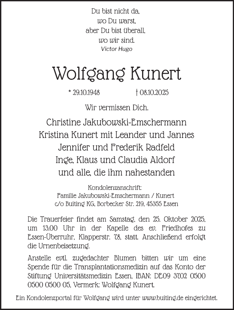 Hier finden Sie alle Traueranzeigen aus der Zeitung, die bisher für Wolfgang Kunert erschienen sind. Weitere Traueranzeigen, die in der Zeitung erscheinen, werden hier ebenfalls aufgelistet